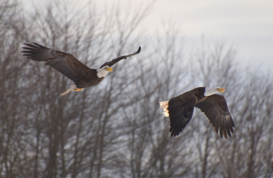 A pair of Bald Eagles fly over Sheffield Mills, N.S.