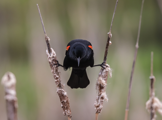 This Red Winged Blackbird landed on 2 different Bullrushes and as they started to separate he seemed to be looking down and wondering what he should do.