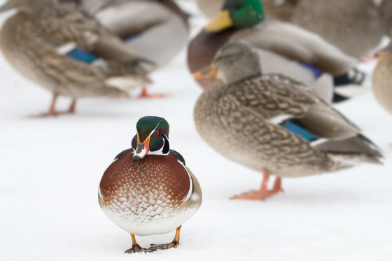 This little Wood Duck has spent the last three Winters among a group of over one hundred Mallards at Collingwood harbour. He seems to choose one female Mallard and sticks with her right through the Winter months.
