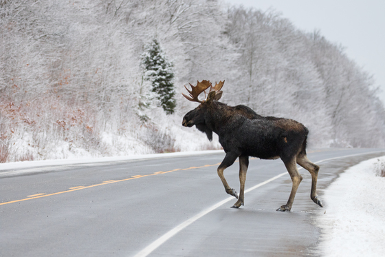Bull Moose makes an early morning trip across Highway 60 through Algonquin, Ontario