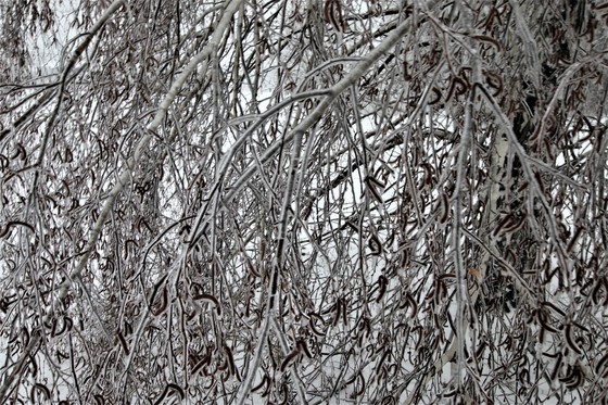 Birch seed pods are seen here encapsulated in thick layers of ice after an overnight freezing rain. As the picture was taken in early April it meant that in the previous fall the pods never had the chance to disperse the seeds, perhaps a consequence of climate change. I always love white birch trees and their golden yellow leaves in the fall.