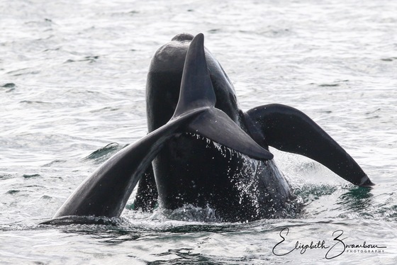 This is one of the most unique photos I've captured of long-finned pilot whales, clearly showing the head of one individual and the tail of another silhouetted against the grey seas of early summer. Cheticamp, Nova Scotia.
