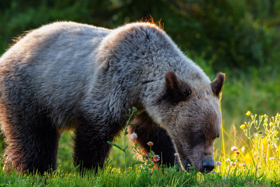 A blonde Grizzly Bear picks out breakfast in some golden sunrise light