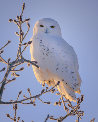 A Snowy Owl looks on from a branch on a frosty morning in rural Alberta