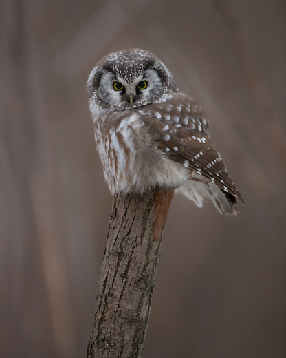 The story is too long !! But it was magic, I found this little owl before daybreak, she had a good hunt with the freezing temperatures of winter she must keep her next lunch under her so that she does not freeze. we can see a bit of dough and tail. (natural hunting not fed of course)