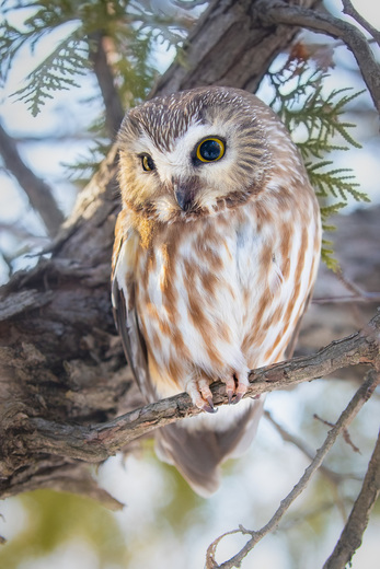 Here is the saw-whet owl !! the smallest of the species in est of canada. In a soft light at the end of the day