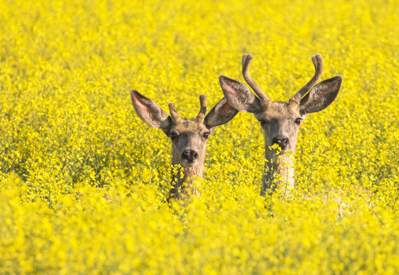 While out on an early morning drive in Southern Saskatchewan, I came across a pair of young Mule Deer bucks, wandering through the canola fields