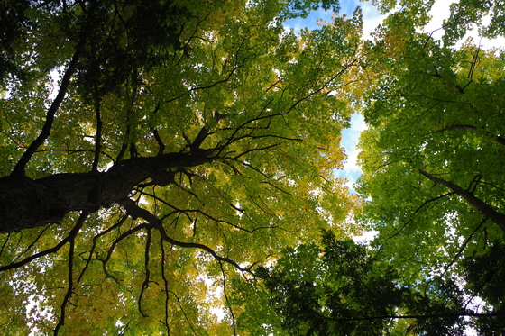 Looking up at the canopy of the Maple giants on a trail at Rouge Park in fall.