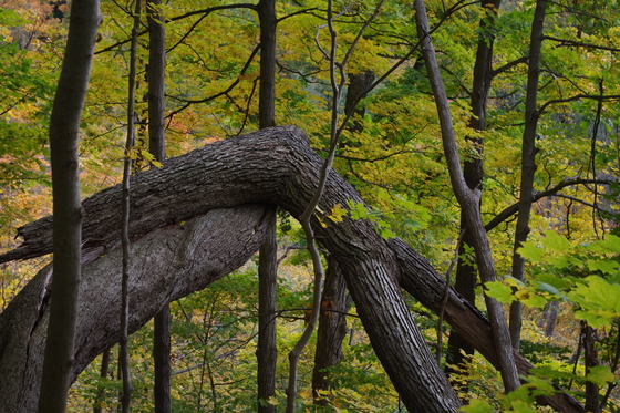 On the trail to Dundas peak, this tree perhaps struck down by lightening or twisted by high winds, made a striking image surrounded by the foliage of the other trees.
