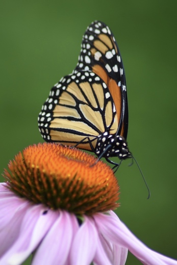 A male monarch butterfly on echinacea flower in my garden.