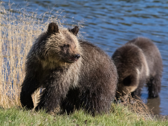 A grizzly bear cub of the year watches mom who was in the river catching a salmon.