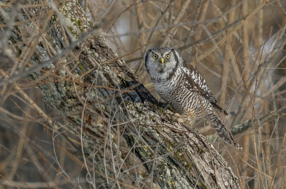 After about an hour of sitting high up in a tree, this beautiful little Northern Hawk Owl flew down to a tree stump where he had cached a vole! "In times of plenty, Northern Hawk Owls may store surplus food in a cache. This may be in the nest, or tree hole, or a fork in a branch."
