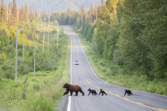 A mother Grizzly Bear leads her cubs out of the forest, and across the highway. Human development is just one of many threats these young bears will have to face as they grow up.