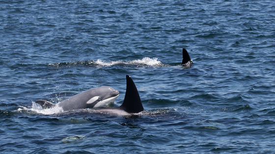 This is T46B1B, also known as Tl'uk - a Coast Salish word for "moon". This 2-year-old calf was born grey rather than black and has received a lot of attention for his incredibly rare colouration.