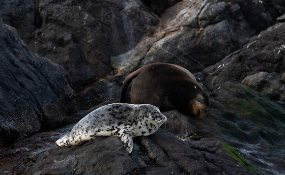 A harbour seal and a California sea lion share a rock for a nap south of Victoria, B.C.