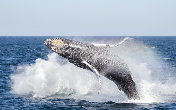 A humpback whale crashes into the wake of another whale below, turning calm seas rough.
