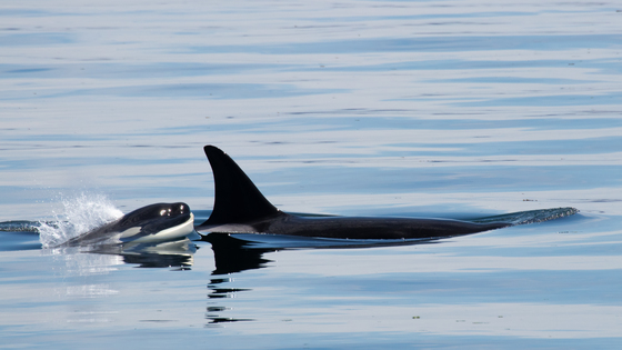 Two transient mammal-eating killer whales make their way through the Juan de Fuca Strait, south of Victoria, B.C. Pictured here is a juvenile in close-pursuit of its mother. This photo was captured just before the water broke over its rostrum.