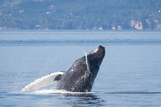 A humpback whale jumped and slapped the water in the July sun for more than half an hour in a fit of excitement! Here he is about to hit the water, falling out of a particularly beautiful breach.
