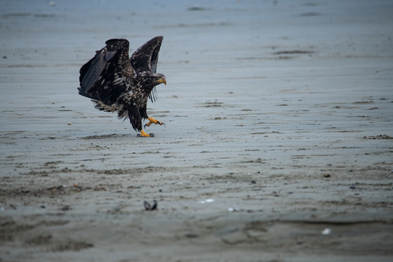 A carcass of a seal was laying on a beach attracting a lot of eagles. I decided to stay there for a while that morning hoping to get some good shots. Young bald eagles are usually less scared of humans, and this one came over very quickly, not mindind my presence at all.
