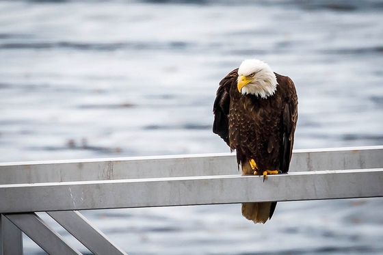 A Bald Eagle sits on a metal stairway from the shore to the boats in Prince Rupert harbour.