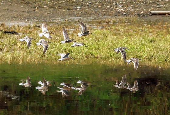 A flock of Short-billed Dowitchers leave the Chown River on Haida Gwaii