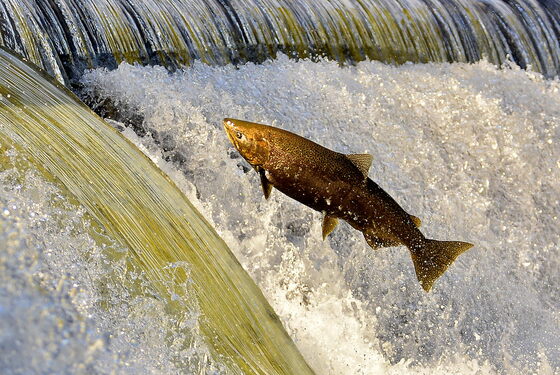 As the course of the light shifts over the river, the salmon continue to run. Female running up followed shortly by a large male