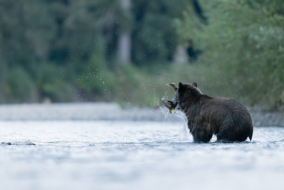 Success! A young grizzly bear tightly grips its slippery evening catch before scampering off into the dense rainforest to eat the salmon in peace. Decomposing salmon carcasses brought to the forest by bears provide essential nutrients to nearby soils like nitrogen and contribute substantially to riparian forest health.