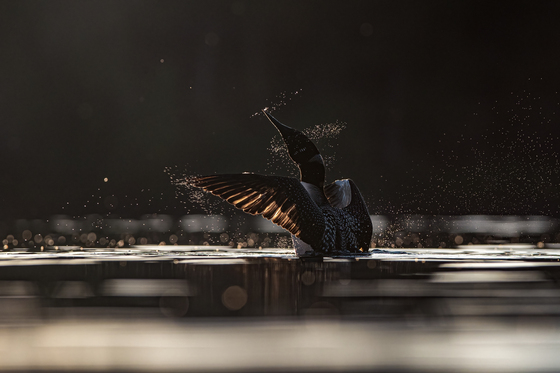 A Common Loon shakes off water and stretches its wings. I captured this image while swimming beneath a floating hide on small lake near Bancroft, Ontario, in August 2022. Backlight from the setting sun highlights the water drops and the outline of the loon.