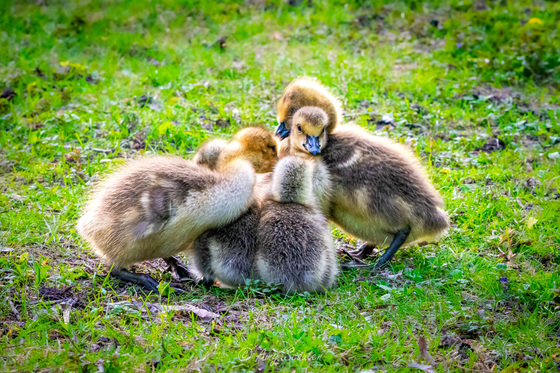 A group of Canada goose goslings engages in an adorable pre-nap cuddle near Mud Lake in Ottawa, Ontario.