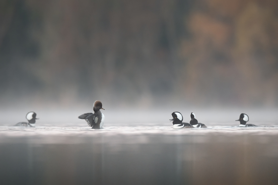 Male Hooded Mergansers compete for the attention of a female on a foggy autumn morning on the lake. I captured this image using a floating hide.