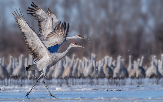 Every winter, thousands of sandhill cranes gather in Long Point, Ontario. In the evening, they gather in large groups and sleep together. In the early morning, they split into small groups to forage for food.