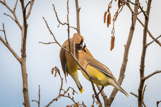 Gorgeous Cedar Waxwings displaying courtship behavior by passing a tree bud back and forth to each other.