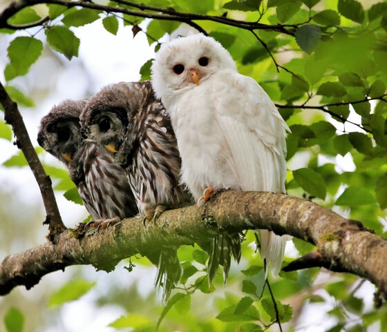 Three Barred Owl Owlets resting .One is white leucistic meaning pigmentation reduced, it is a rare sighting in Port Coquitlam BC.