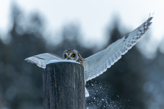 When I was sitting in my vehicle watching this Short-eared Owl, it was quite windy and I think it underestimated how strong the wind was. The owl got pushed off the post, but quickly tried to recover and landed with a stronger grip this time.