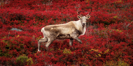 A woodland caribou (Rangifer tarandus caribou) pauses amidst the scarlet-tinted barrens of Newfoundland’s Burin Peninsula. Each autumn, the landscape ignites in deep reds and russets, mirroring the resilience of this isolated island population. It is one of the few places where caribou still roam freely in Atlantic Canada.