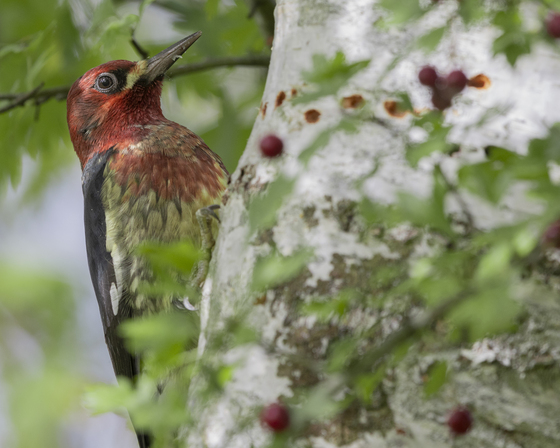 Busy drilling holes to be revisited later to eat the sap and attracted insects.