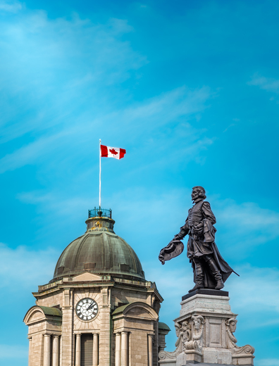 Tagged: quebec city canada architecture heritage travel culture flag blue sky history landmark ch teau frontenac building clock_tower tower adult male man person statue sculpture daytime monument facade memorial dome morning historic_site