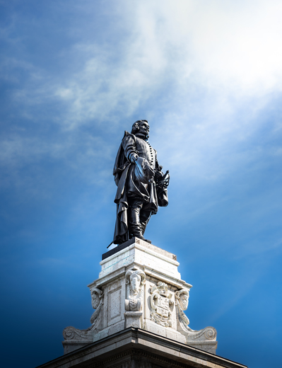 Tagged: quebec city canada architecture heritage travel culture flag blue sky history landmark ch teau frontenac building monument adult male man person statue sculpture daytime art memorial visual_arts list_of_nonbuilding_structure_types stone_carving