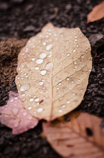 Raindrops on a beautiful fallen leaf, juxtaposed against a gravel road.