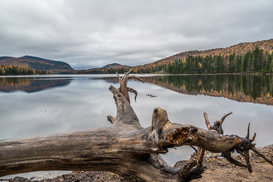 quebec landscape nature tremblant autumn outdoors wood plant tree driftwood water cloud body_of_water natural_landscape bank wilderness lake reflection cumulus tarn