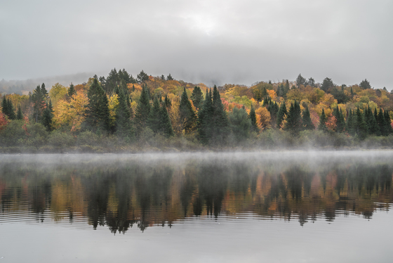 quebec landscape nature tremblant autumn outdoors plant tree fir conifer lake water weather scenery water_resources atmospheric_phenomenon natural_landscape bank reflection forest cloud mist