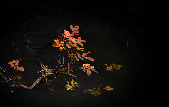 a minimalistic image of a single branch of beautifully coloured autumn leaves. Abraham Lake , alberta