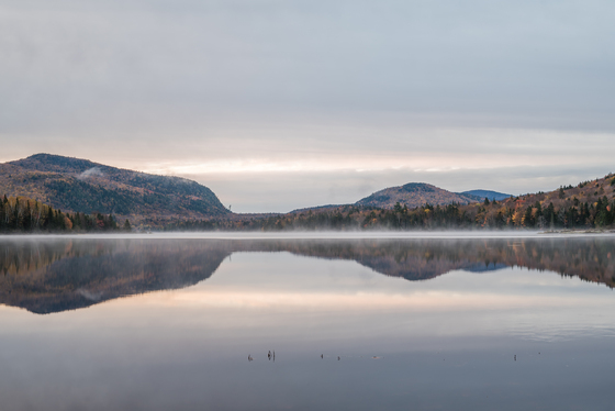 quebec tremblant landscape nature outdoors autumn sunrise lake water reservoir scenery sky water_resources body_of_water cloud mountainous_landforms mountain natural_landscape horizon hill