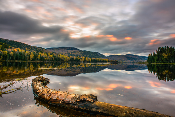 quebec tremblant landscape nature outdoors autumn sunrise plant tree lake water wood fir scenery sky waterfront blue water_resources cloud body_of_water natural_landscape watercourse reflection