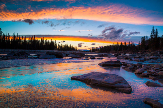 A sunset sky colour reflects on the newly forming ice of the Red Deer River