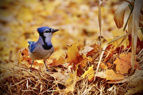Tagged: blue jay autumn fall leaves straw colourful orange yellow looking feathers crest beak eye leaf plant animal bird blue_jay bluebird twig wing grey songbirds feather
