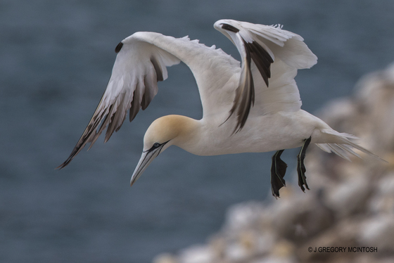 A visit to Cape St Mary's on the south east coast of the Avalon Peninsula yields a whole lot of fun experiences watching Northern Gannets fly and interact with each other at one of Canada's busiest breeding colony...well worth the drive from St John's and the hike in from the parking lot, there's a gazillion ways to be entertained. This Gannet is focused on its intent to land safely!!!