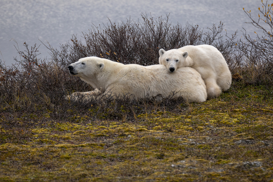 I love watching older polar bear cubs navigate around with their mother. In this series of shots, a 22 month old cub is stuck to its mothers hip as they explore an outcrop of pre-cambrian shield. Nearly the size of its mom, it has a lot of confidence, and still lots of curiosity.