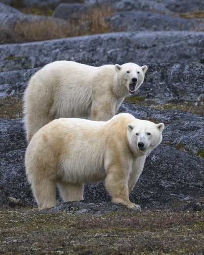 I love watching older polar bear cubs navigate around with their mother. In this series of shots, a 22 month old cub is stuck to its mothers hip as they explore an outcrop of pre-cambrian shield. Nearly the size of its mom, it has a lot of confidence, and still lots of curiosity.