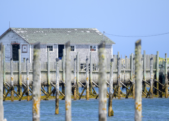 Weathered wharf and shingled shed stand quietly over the blue waters of Grand Manan - echoes of maritime life etched in wood and tide.